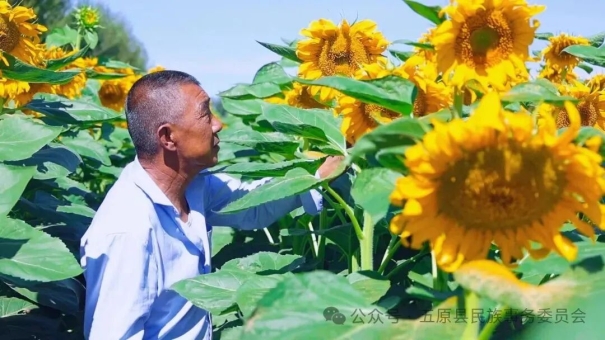 向日葵不仅是五原的“金色名片”,更是促进各民族交往交流交融、铸牢中华民族共同体意识的重要载体。全县葵花种植面积稳定在120万亩以上,全产业链年产值超67亿元,带动15万人从业、9000人稳定就业,农民人均来自葵花的纯收入超万元。如今,全国每7粒食用葵花籽中就有1粒来自五原,这不仅是产业的荣耀,更是各族群众团结奋斗的结晶。在隆兴昌镇同联村等种植区,各族群众通过“企业+农户”“党支部+合作社”“百企联百村建百园带万户”等模式,共同参与土地流转、规模种植、田间管理,形成了“共同劳动、共同经营、共同受益”的生动局面。田间地头,各民族群众互学技术、协作劳作。产业链上,企业、合作社、农户紧密联结,葵花真正成为各族群众的“团结花”“致富花”。