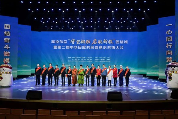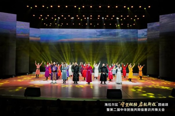 呼伦贝尔市海拉尔区举办第二届中华民族共同体意识共铸大会 凝聚团结共识 迸发奋进力量, 近日,海拉尔区“守望相助 启航新程”团结颂暨第二届中华民族共同体意识共铸大会在呼伦贝尔大剧院隆重举行。市委常委、统战部部长马跃东,市委统战部副部长、市工商联党组书记、常务副主席孙恒波,市委统战部副部长、市民委党组书记、主任何伟等领导出席。区委书记杨杰、区委副书记、政法委书记杜海娇等区领导,市直、区属相关部门负责人、各行各业集体代表以及各族各界群众代表齐聚一堂。 活动紧扣“同心”“同向”“同行”三大篇幅,邀请区域经济、民生福祉、文化发展等来自各战线的16家集体,并现场分享其中9家集体的生动故事。通过基层实践的鲜活展示、亲历者的真情讲述等多元形式,一个个平凡却闪光的身影跃然眼前。这些集体中,既有深耕文化传承、搭建民族“连心桥”的坚守者,也有投身乡村振兴、赋能产业发展的实干家,更有扎根民生一线、守护邻里和睦的贴心人,他们用自己的力量让海拉尔发展日新月异,立体铺展海拉尔区各族群众同心向远、同向攻坚、同行筑梦的时代长卷。与此同时,精彩文艺节目轮番上演,以中华传统文化之美传递民族团结的深厚情谊,让中华民族共同体意识浸润人心。这场历时两个月精心筹备的盛会,既是对海拉尔区铸牢中华民族共同体意识工作的一次全面检阅,更是对各族群众团结奋进精神的一次集中展现。海拉尔区将以此为契机,持续深化铸牢中华民族共同体意识宣传教育,将民族团结进步事业与区域发展战略同频共振、深度融合,以团结之力汇聚发展动能,用奋进之姿铸就时代实绩,共同谱写守望相助、启航新程的壮美篇章!初审:乌丽雅苏复审:白斯琴终审:李玉兰制作发布:内蒙古自治区地方语言文字研究应用中心(内蒙古民族团结杂志社)