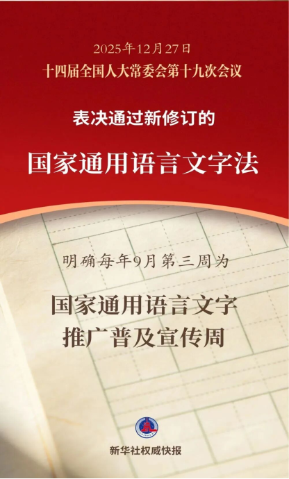 十四届全国人大常委会第十九次会议12月27日表决通过新修订的国家通用语言文字法,明确每年9月的第三周为国家通用语言文字推广普及宣传周。