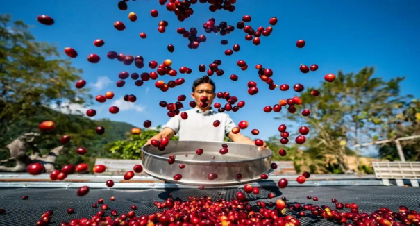 ▲农民在云南省普洱市晾晒咖啡果。新华社记者 江文耀 摄